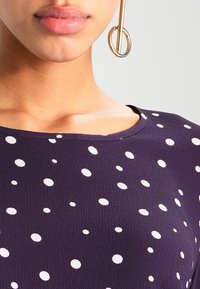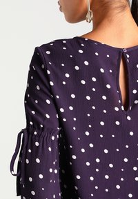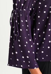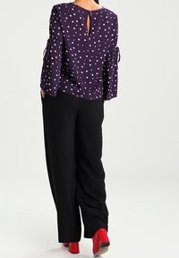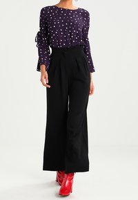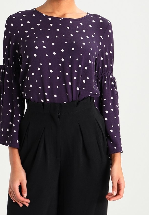 Blouse violette à pois avec manches longues à volants. Associée à un pantalon noir taille haute avec plis et fermeture éclair.