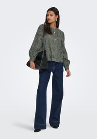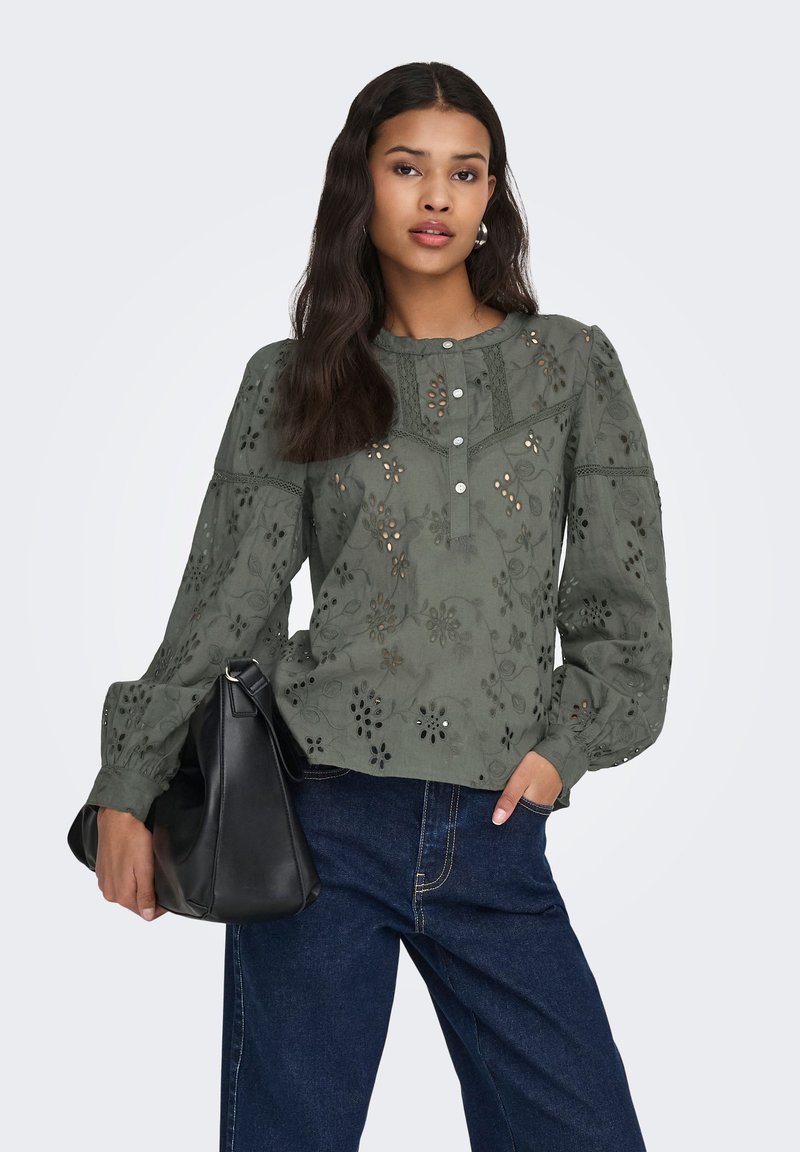 Blouse vert olive avec broderie florale en œillets, col rond, fermeture par boutons et manches bouffantes. Associée à un jean foncé et un sac noir.