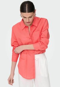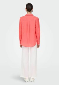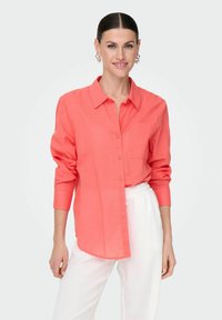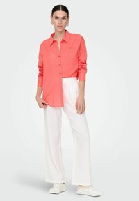 Chemise boutonnière corail avec col et manches longues, dotée d'une poche avant. Associée à un pantalon blanc texturé.