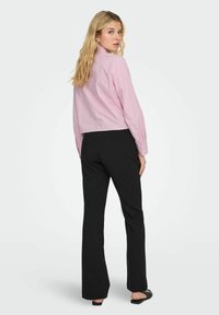 Chemise rose recadrée avec un col à boutons, ornée de petits motifs en forme de cœur et manches longues, associée à un pantalon noir taille haute.