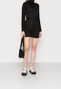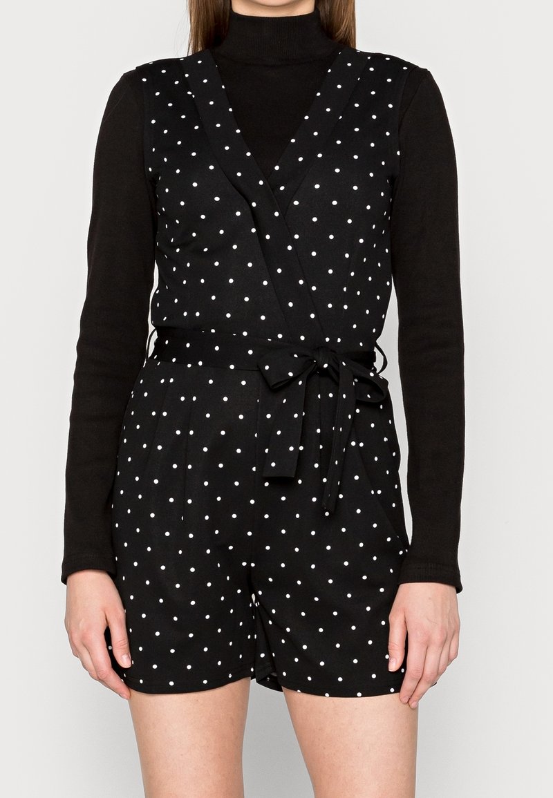 Combinaison courte noire à pois blancs, design croisé, col en V et ceinture à nouer. De longues manches noires en dessous créent un effet superposé.