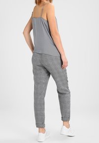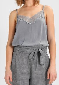 Femme portant un caraco gris clair orné de dentelle, rentré dans un pantalon taille haute à carreaux noir et blanc avec une ceinture nouée.