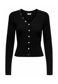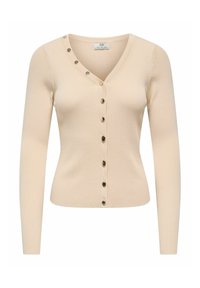 Cardigan beige en maille avec encolure en V, manches longues et fermeture à boutons sur le devant. Il présente des boutons décoratifs le long de la couture de l'épaule.