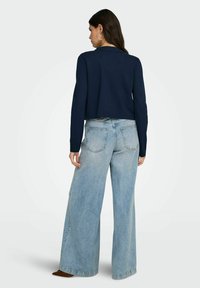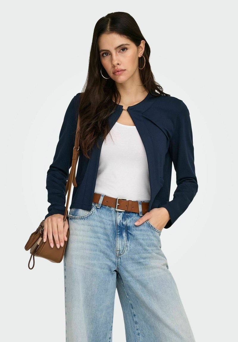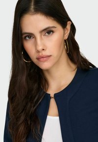 Femme aux longs cheveux noirs portant une veste bleu marine sur un haut blanc, un jean bleu clair avec une ceinture marron, de grandes boucles d'oreilles créoles et un sac à épaule marron.
