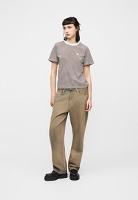 Jeune femme aux cheveux courts et foncés portant un t-shirt à manches courtes rayé noir et blanc et un jean marron délavé ample.