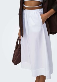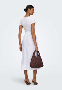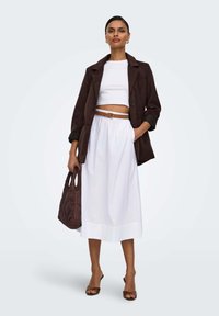 Femme portant une jupe midi blanche, un blazer court marron, une ceinture marron, des sandales à talons marron, et tenant un sac à main matelassé marron.
