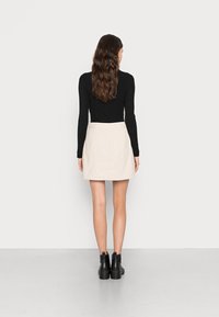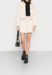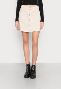 Mini-jupe en velours côtelé beige clair avec fermeture à boutons sur le devant, deux poches plaquées et un ourlet net. Portée avec des bottines noires.