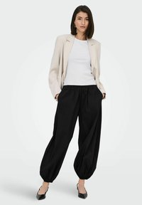Personne portant un pantalon ballon noir ample avec des poignets élastiques, un haut blanc, une veste beige et des escarpins noirs à talons aiguilles, debout les mains dans les poches.