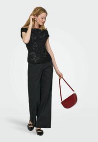 Femme portant un pantalon noir à jambes larges et un haut noir à motif floral, tenant un petit sac à main rouge, debout les pieds écartés avec des ballerines noires.