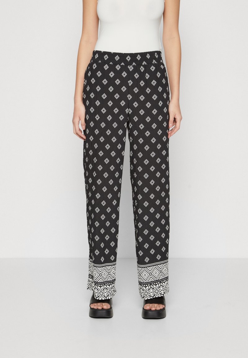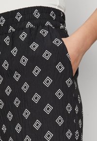 Pantalons noirs à motifs avec un design en losanges et des accents blancs, ourlet texturé. Associés à des sandales noires à bout carré.