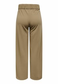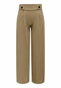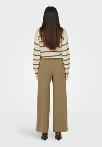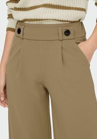 Pantalon à jambes larges en tissu kaki, doté d'une taille haute, de poches latérales et de boutons circulaires noirs distinctifs à la ceinture.