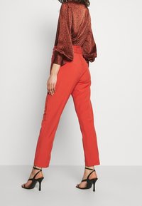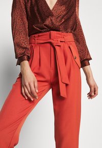 Pantalons ajustés couleur rouille avec une taille ceinturée, des jambes fuselées et des ourlets retroussés, associés à des espadrilles à lanières de teinte claire.