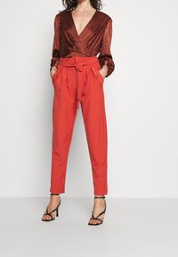Pantalon rouge sur mesure à taille haute, doté d'une ceinture à nouer, de poches latérales et d'une coupe décontractée. Le tissu semble lisse et structuré.