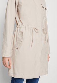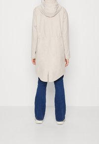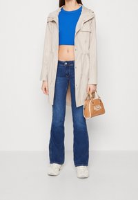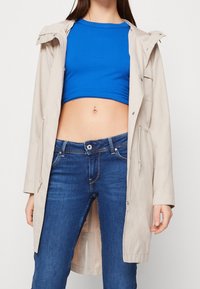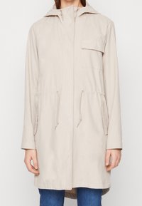 Femme portant une veste à capuche beige clair avec une fermeture éclair à l'avant, une taille à cordon, une poche à rabat sur la poitrine et des poches latérales, par-dessus un jean bleu.
