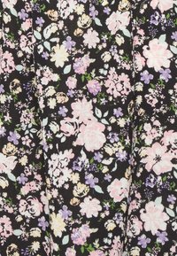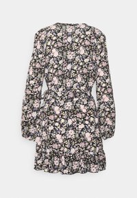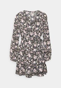 Robe portefeuille noire à fleurs avec manches longues, col en V plongeant, taille cintrée avec lien, et ourlet à volants. Fleurs en rose, blanc et vert.