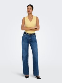 Femme debout, main dans la poche, portant un haut sans manches jaune à col et un jean bleu avec une ceinture noire, fond neutre.