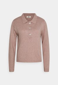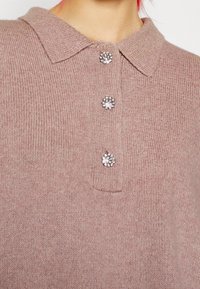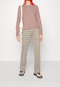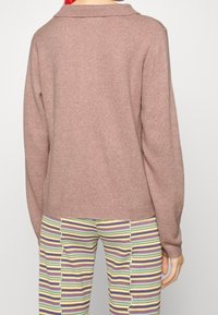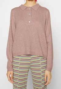 Pull-over en maille rose poussiéreux avec un col, orné de trois boutons floraux. Le bas est coupé de manière raccourcie. Assorti à un pantalon rayé multicolore.