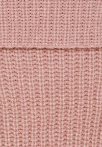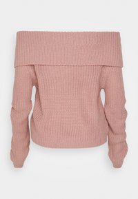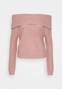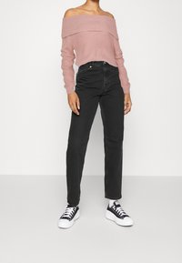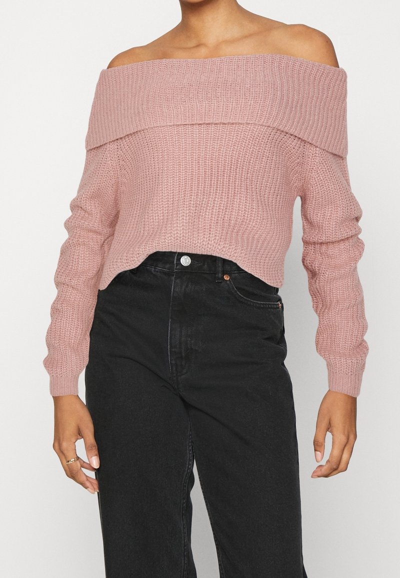 Femme portant un pull tricoté rose poudré à épaules dénudées et un jean noir taille haute, debout devant un fond uni.