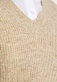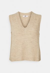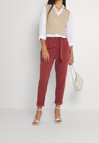 Femme portant un gilet sans manches en tricot beige sur une chemise blanche boutonnée, et un pantalon taille haute rouge rouille avec ceinture nouée à la taille, les mains dans les poches.