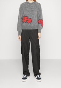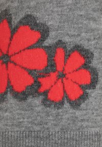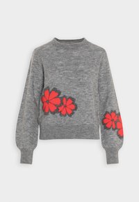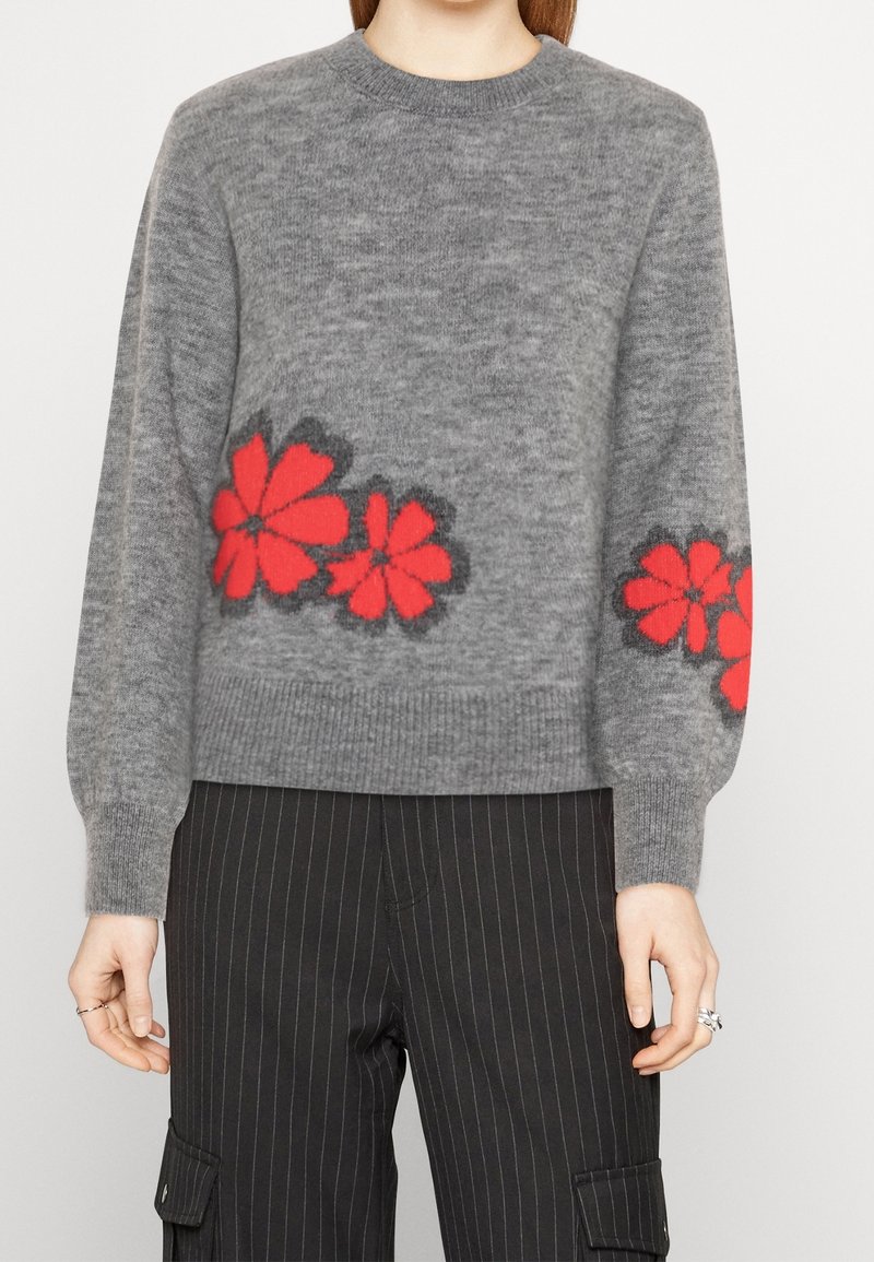 Pull en maille gris à manches longues, col rond, avec une broderie florale rouge sur le bas. Texture douce et coupe décontractée.
