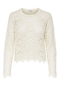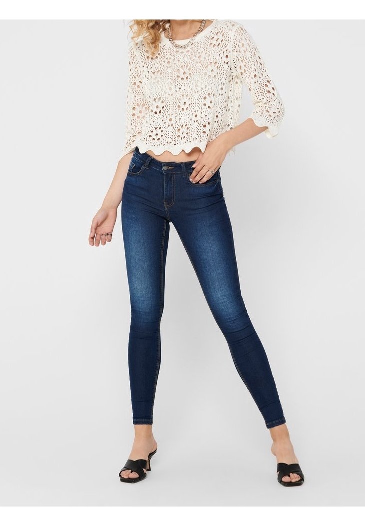 Femme portant un jean skinny bleu foncé, un crop top en crochet blanc, des talons noirs ouverts à l'avant et un collier chaîne, debout avec une main sur la hanche.