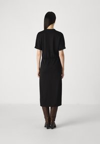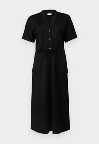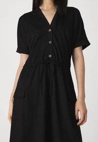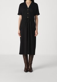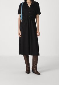 Femme portant une robe midi noire avec des boutons et une ceinture à la taille, associée à des bottes en cuir marron montant jusqu'aux genoux, debout sur un fond uni.