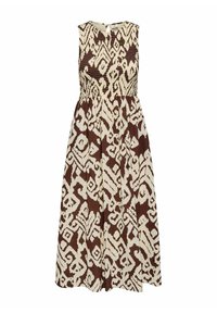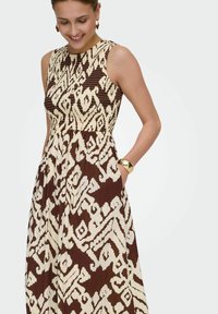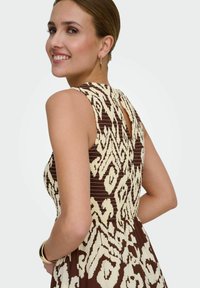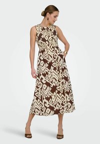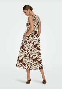 Femme portant une robe midi sans manches avec des motifs abstraits tournoyants marron et beige, debout les mains derrière le dos et portant des sandales.