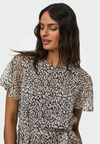 Femme posant dans une robe imprimée animal noire et blanche à manches courtes, ceinturée, avec un ourlet à volant, sur un fond uni clair.