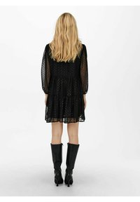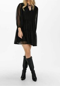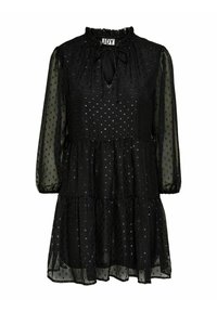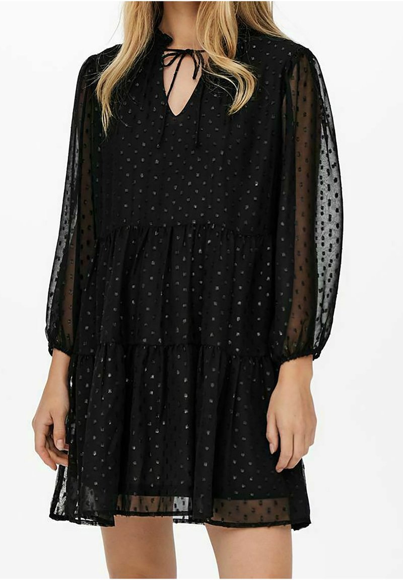 Robe noire à étages en tissu transparent avec des points texturés, manches longues bouffantes et un lien au niveau du col. Coupe arrivant au genou.