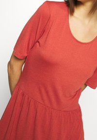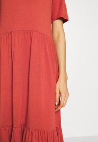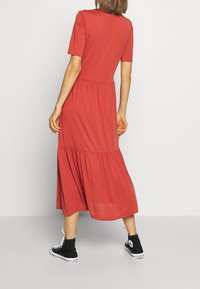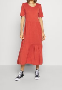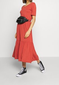 Robe midi en coton rouge avec manches courtes et encolure ronde, dotée d'une jupe à volants froncés. Associée à des baskets montantes noires.