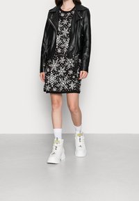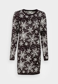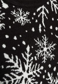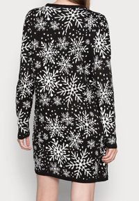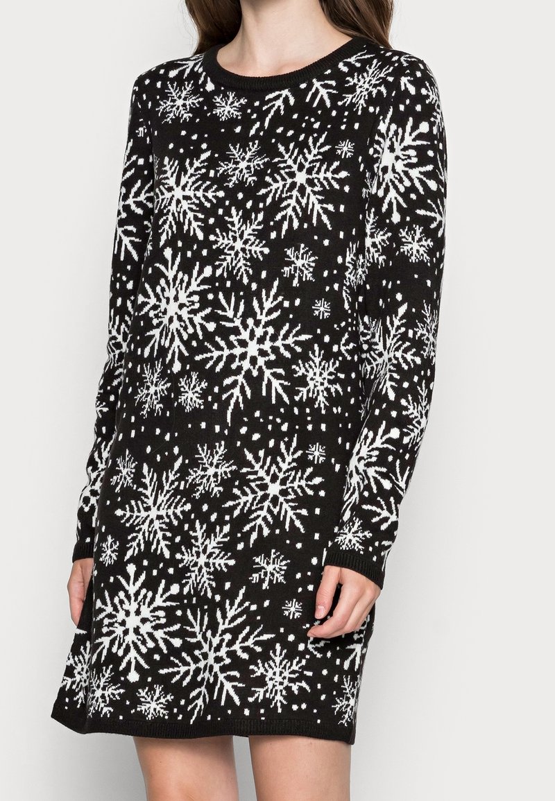 Robe en tricot noire à manches longues avec des motifs de flocons de neige blancs portée par une personne, montrée des épaules jusqu'au milieu des cuisses.