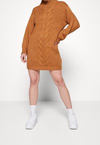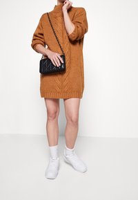 Femme portant une robe-pull en maille torsadée marron à manches longues, associée à des chaussettes blanches et des baskets blanches, debout les jambes écartées.