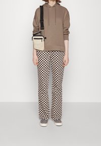Personne portant un sweat à capuche marron avec cordons et un pantalon à carreaux noir et blanc, debout devant un fond uni.