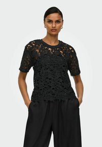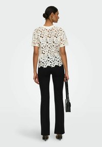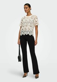 Femme portant un haut court à manches courtes en dentelle blanche à fleurs, un pantalon noir, des boucles d'oreilles et des bagues dorées, tenant un sac à épaule noir.