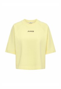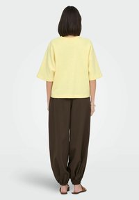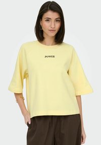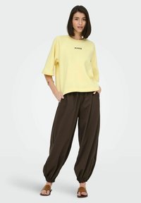 Femme aux cheveux foncés mi-longs portant une chemise ample jaune pâle avec le texte "POWER" et un pantalon large sombre, debout devant un fond uni.