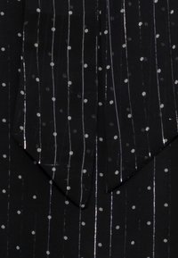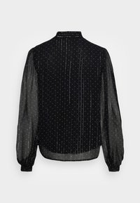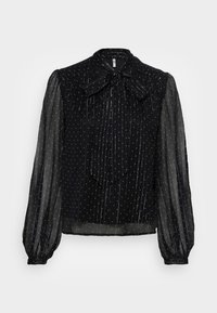 Blouse noire avec des manches longues transparentes et un col en nœud. Présente des rayures verticales et de petits pois argentés sur le tissu.