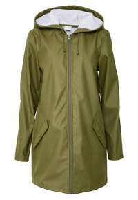Personne portant une veste à capuche zippée vert olive et un pantalon à carreaux gris avec des rayures jaunes, debout avec une main dans la poche.