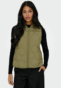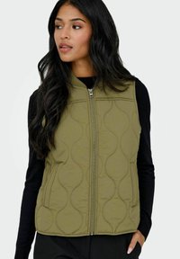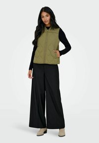 Femme aux longs cheveux foncés portant un gilet matelassé sans manches vert olive sur un haut noir à manches longues et un pantalon large noir, debout avec une main dans la poche.
