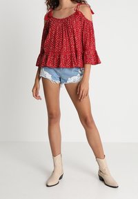 Femme portant un chemisier rouge à épaules dénudées avec des motifs floraux et triangulaires, et un short en denim bleu avec des détails en dentelle blanche.
