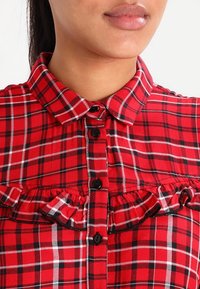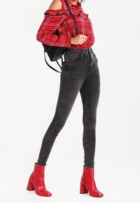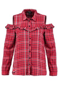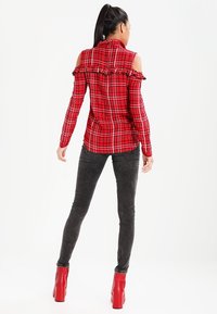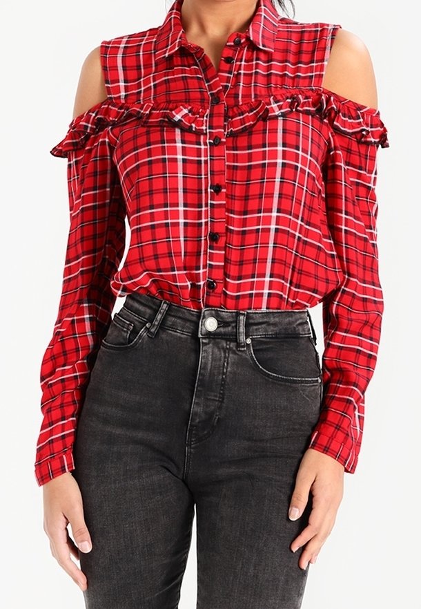 Blouse rouge à carreaux avec épaules dénudées et volants, fermeture boutonnée à l'avant, associée à un jean en denim noir taille haute.