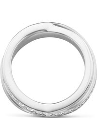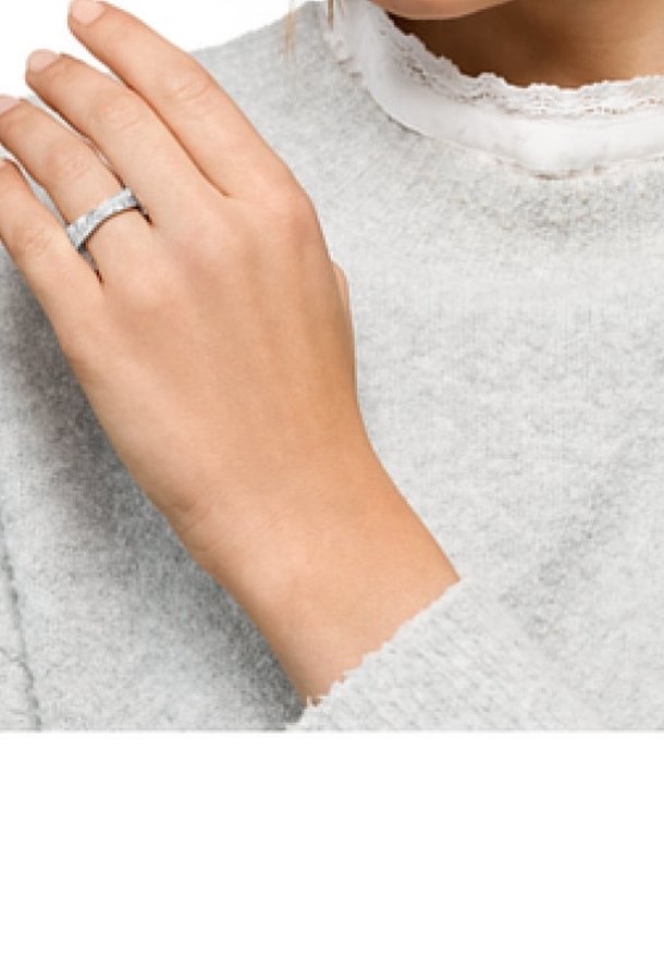 Main gauche avec une bague en argent ornée de petits diamants sur l'annulaire, reposant près du col d'un pull gris avec un col en dentelle.