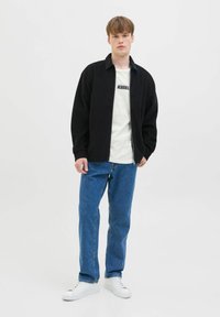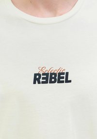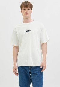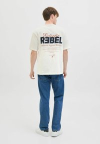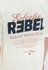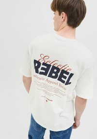 Jeune homme debout, tourné de dos, portant un t-shirt blanc avec l'inscription "Eclectic Rebel Authentic Apparel Division" et un jean bleu avec des baskets blanches.