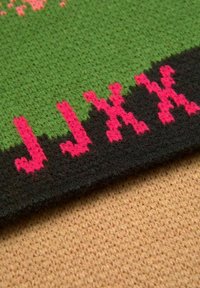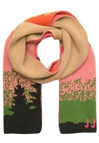 Écharpe tricotée aux couleurs beige, rose, vert, orange et noir, ornée d'un motif floral et pliée en forme de boucle.