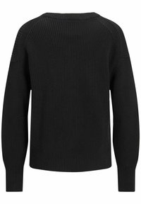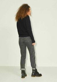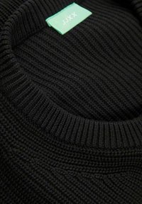 Pull en tricot noir avec une texture côtelée, un col rond et une coupe ample, associé à un jean gris foncé. Le tissu semble chaud et confortable.