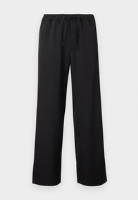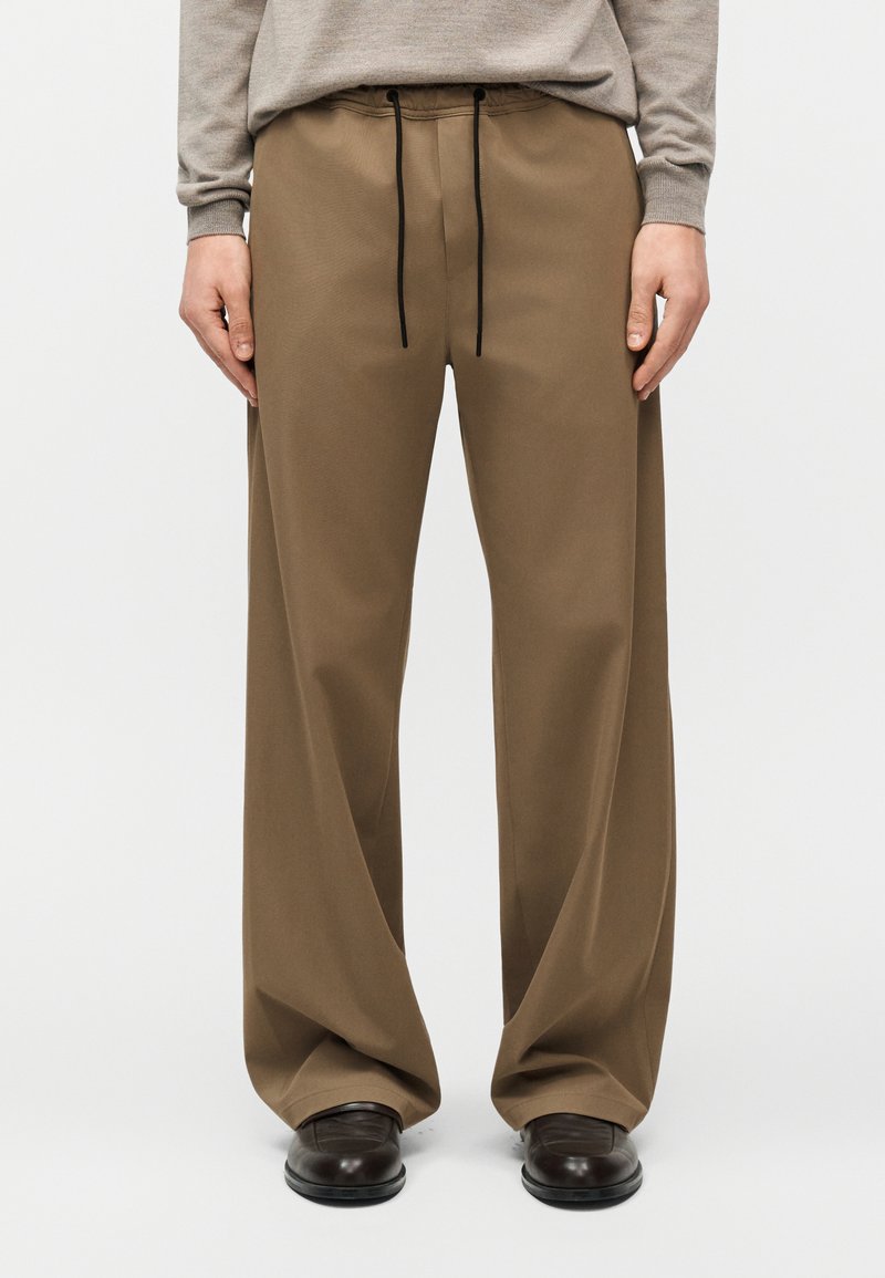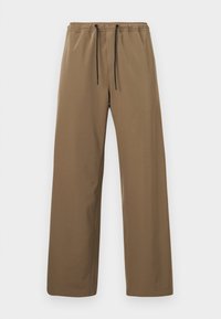 Pantalon marron à coupe droite avec taille élastique et cordons noirs, présenté sur un fond clair uni.