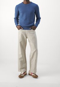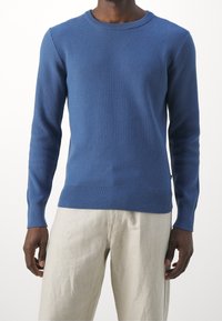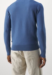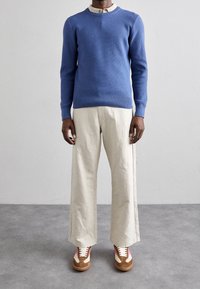 Homme portant un pull texturé bleu par-dessus une chemise col beige avec un pantalon beige clair, debout devant un fond uni clair.