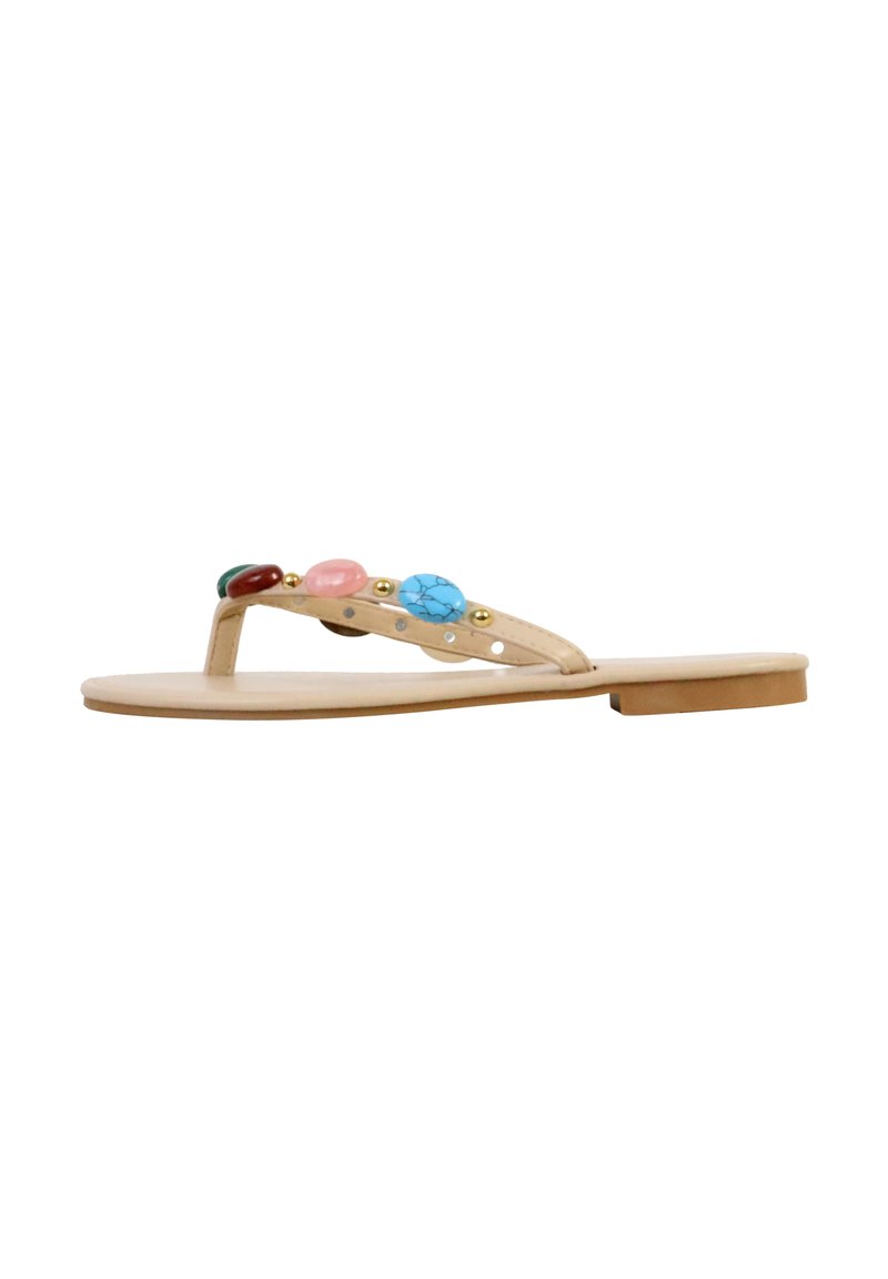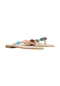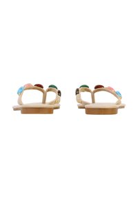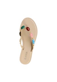Sandale plate beige avec bride entre les orteils décorée de pierres ovales multicolores et de petites perles dorées, vue de l’intérieur.