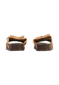 Sandale marron à semelle plate avec des brides croisées en daim beige ornées de pompons et de petits détails en perles.
