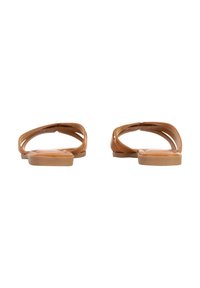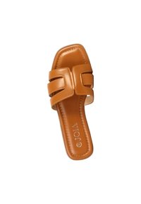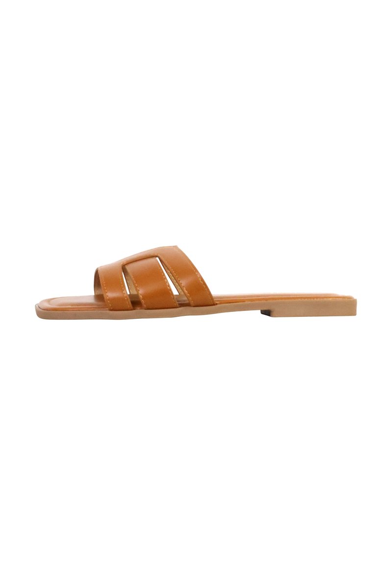 Sandale plate couleur beige avec trois larges brides en cuir et un design à bout carré sur fond blanc uni.