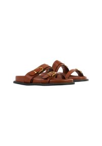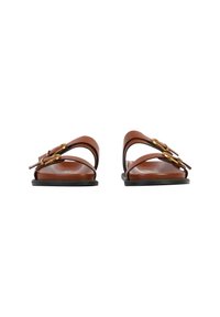Sandale mule en cuir marron avec deux brides ajustables équipées de boucles dorées et une semelle plate noire.